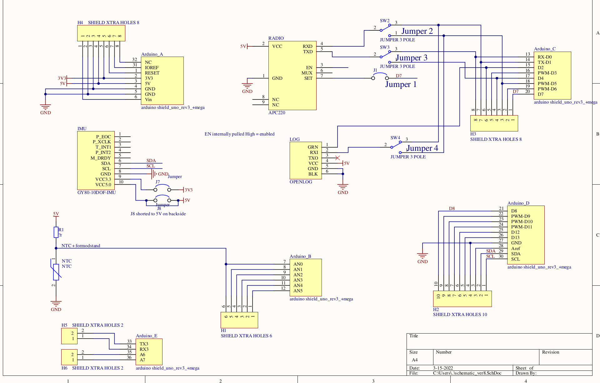 Shield vrs 8 (2022)Shield version 8 has 4 jumpers J1 to J4 for configuring connection to the apc220 radio and thebg openlog.