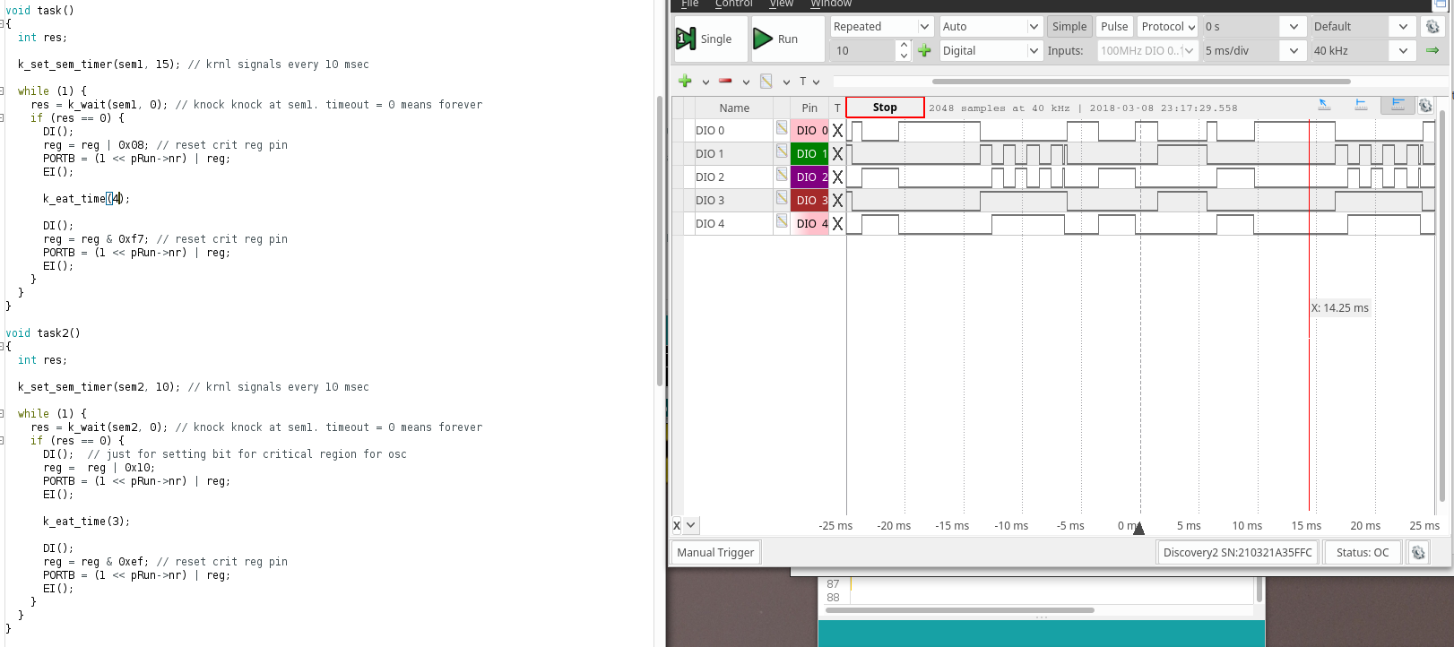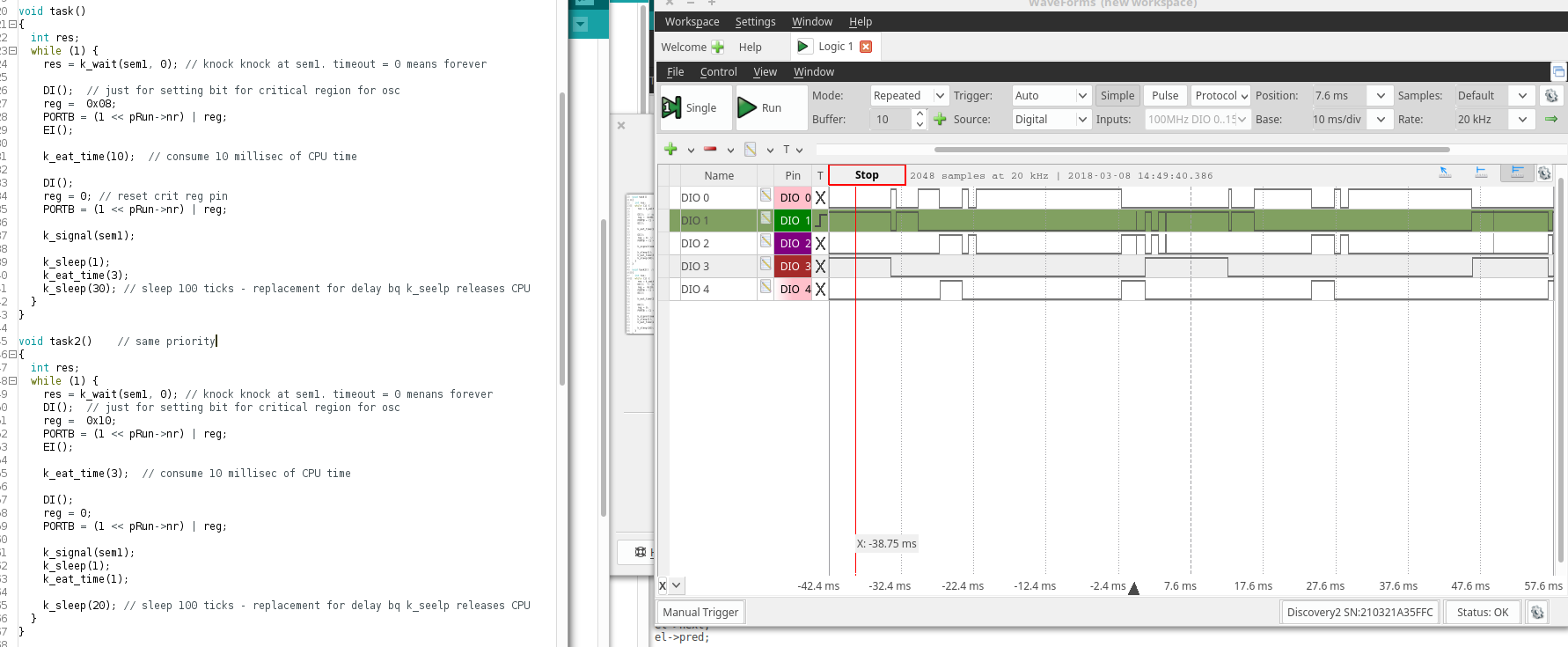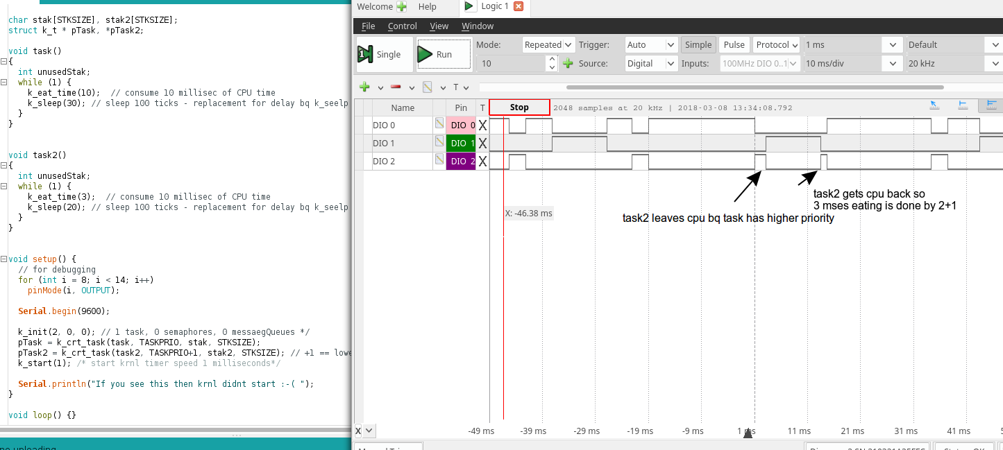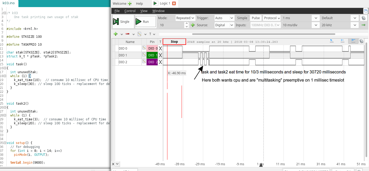 In K02 both tasks (task(DIO 1) and task2( DIO 2) is