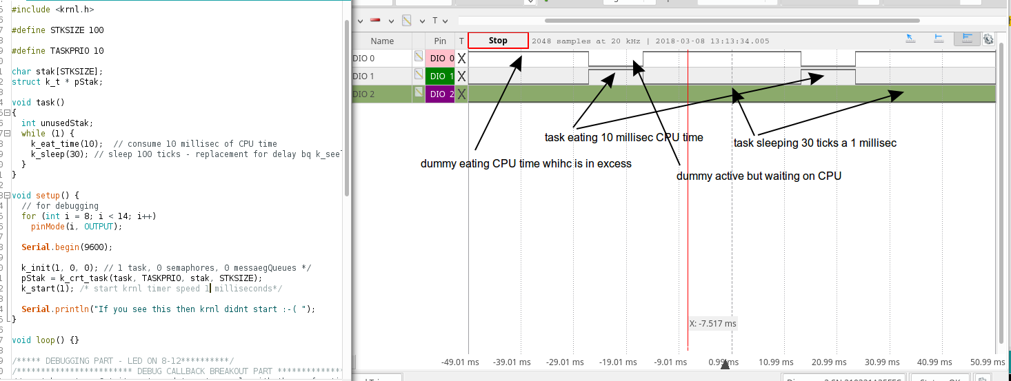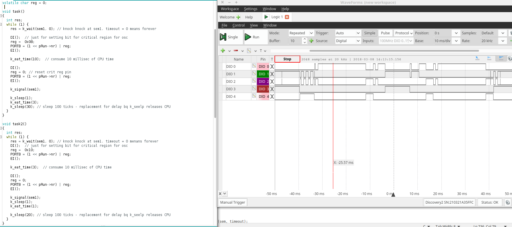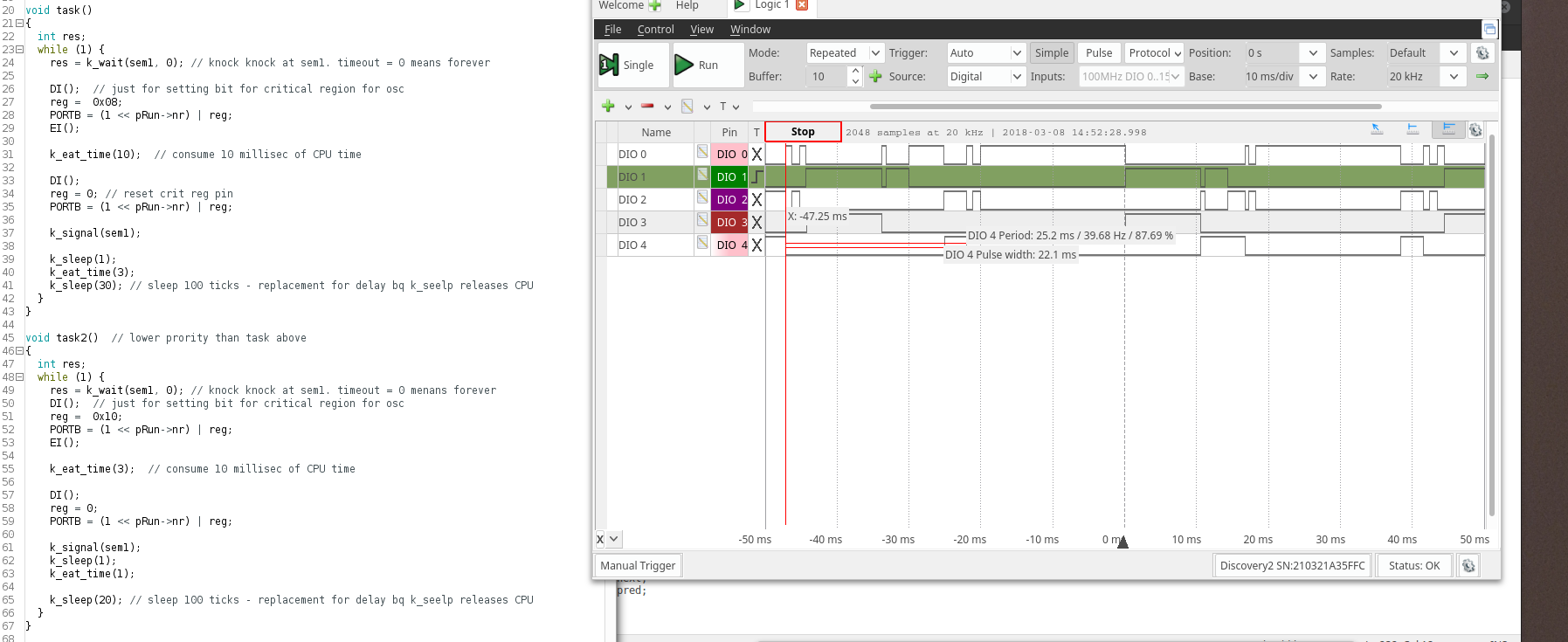 In K02 both tasks (task(DIO 1) and task2( DIO 2) is