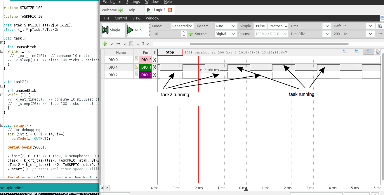 task and task2 (DIO 1 and DIO 2) is sharing CPU every 1 msec (round robbin)