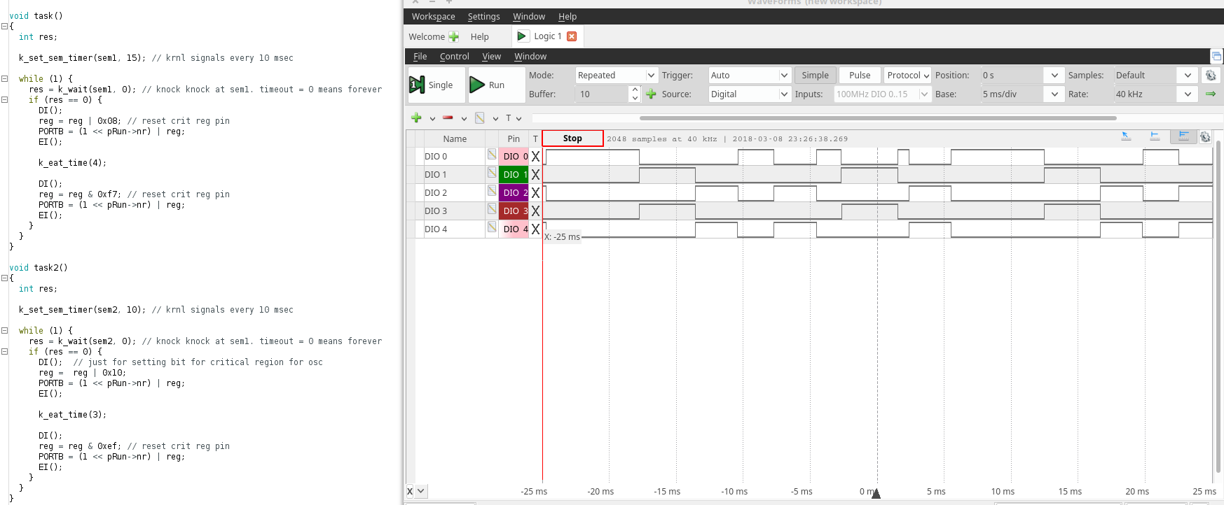 task(DIO 1) is running approx every 40 msec andd eating 10 msec of time.