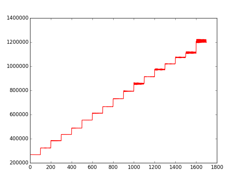 Der er målt 100 gange for hver vægt. Dvs 100 samples med 20 millisekunders interval (50Hz samplingsfrekvens) Vægtene er 0, 100,200,300,… gram Plot over målinger