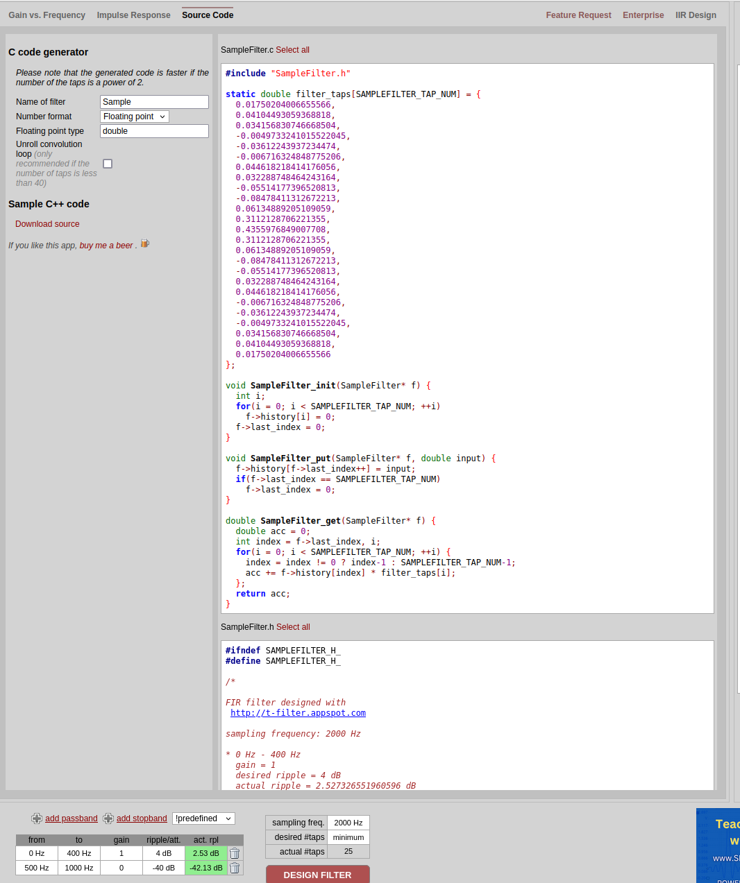 Higher order digital filters - a commentHigher order digital filters is rather complicated. Another way to do it is by setting requirements to your freqyency response Here is a link to very pro homepage for designing digital filters: http://t-filter.engineerjs.com/ You can design rather complex filters but here we will stick to a low pass filter Here can shall