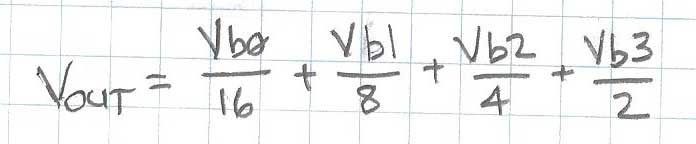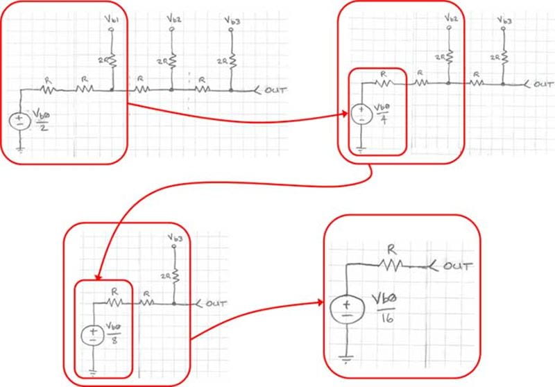Figure 7: Calculating the contribution of Vb0 to the output We can see that the voltage contribution from bit b0 is 1/16th of the logic high voltage level. Each bit stage that this voltage passes through cuts the contribution by a factor of 2. You may begin to see a theme here… Next, we’ll compute the contribution from bit b2, as shown in Figure 8 below: