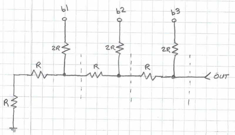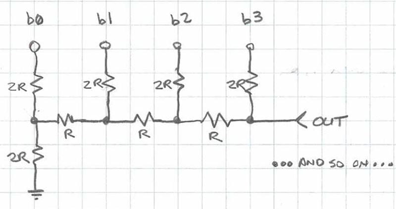 The math behind R2RIn the following is very nice introduction written by Allan Wolke. All credit goes to him. In the bottom of this page is some quick adn dirty implementation hints You can download this page as pdf here Jens DAC by use of R2R networkoriginal by Allan Wolke June 23 2015 at https://www.tek.com/en/blog/tutorial-digital-analog-conversion-r-2r-dac