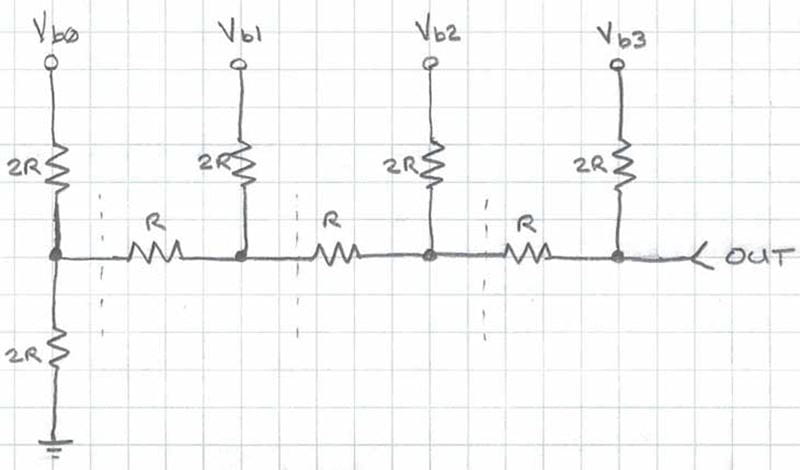 Figure 1: A 4-bit R-2R Network The R-2R resistor ladder network directly converts a parallel digital symbol/word into an analog voltage.