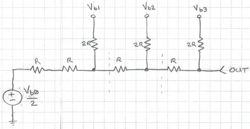 Figure 5: 4-bit R-2R example We start by replacing the circuit to the left of the left-most cut-line with its Thevenin equivalent. Figure 6 shows the Thevenin equivalent, which is the series resistor of value R (parallel combination of two 2R resistors), and the open circuit voltage from the resistor divider (Vb0/2).