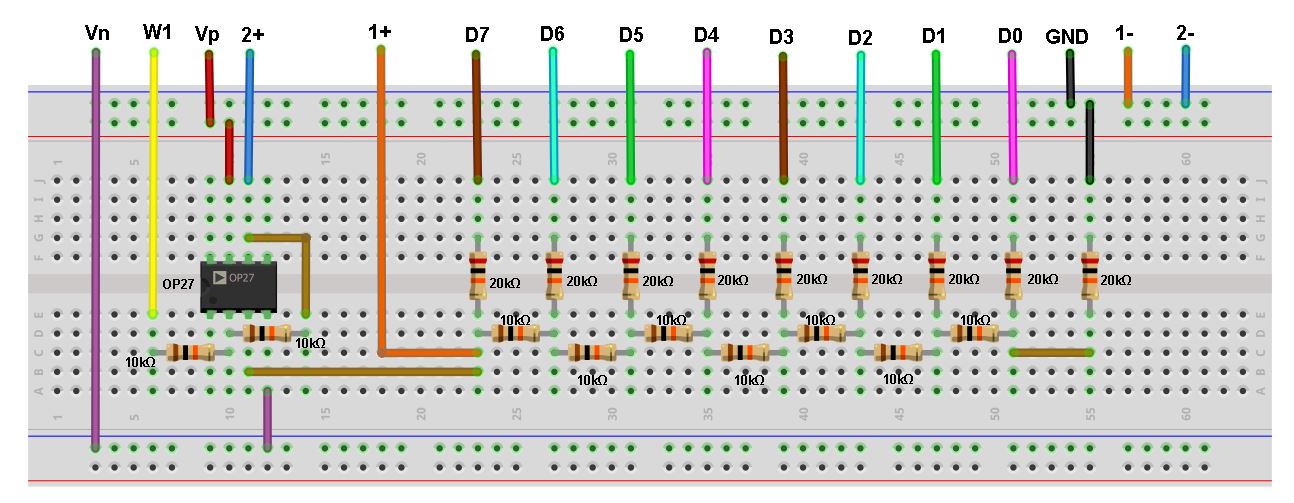Simple non-explainded mockupsee here for orginal Use 10kOhm (R) and 20kOHm(2R) They will give you a low current load on the digital pins. Many digital pins have a builtin current limitation for one pin AND for the sum of output of digial pins. Simple vero board mockup for a 8 bit R2R DAC. Use 20kOhm for 2R and 10kOhm for R values /Jens