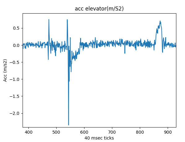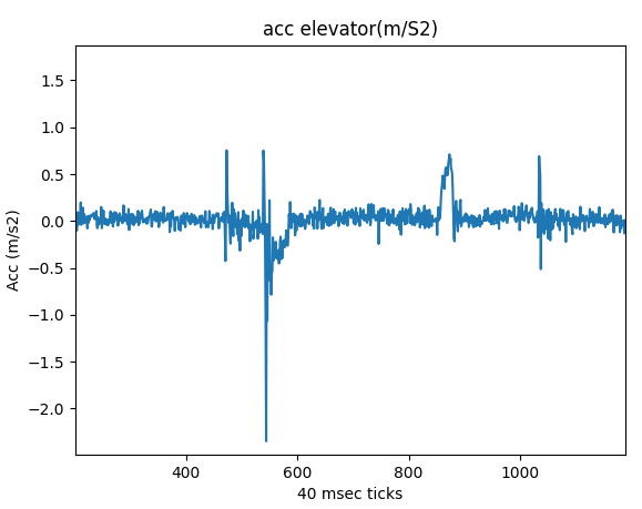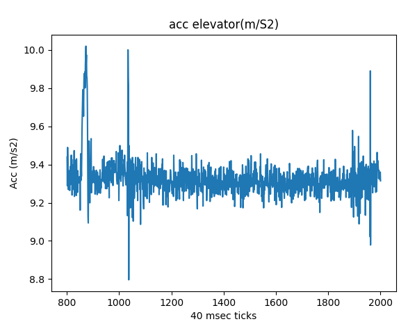 By inspection the lower plot( axis z) shows start of lift going down at 500+ (500*40msec after start). Stop in cellar is approx 800. Going up starts at 2000+ and arrival at 2250 approx x and y axis shows only a short shaken at start/stop. This is in accordance because z axis is point up from the shield. SO from here we only look at acceleration in z axis. AccelerationAcceleration (in Z axis) is found in