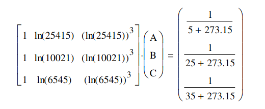 # Rs * [A,B,C] = (1/temperatures) -> [A,B,C] = inv(Rs) * (1/temps)